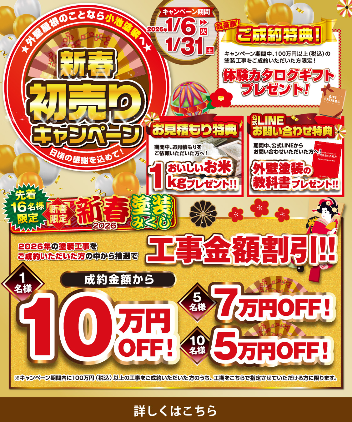 2026.01.01 【狭山市 外壁塗装】最大10万円OFF|外壁・屋根塗装 新春初売りキャンペーンのお知らせ こんにちは。 明けましておめでとうございます。 本年もよろしくお願いいたします。 埼玉県狭山市の塗装...